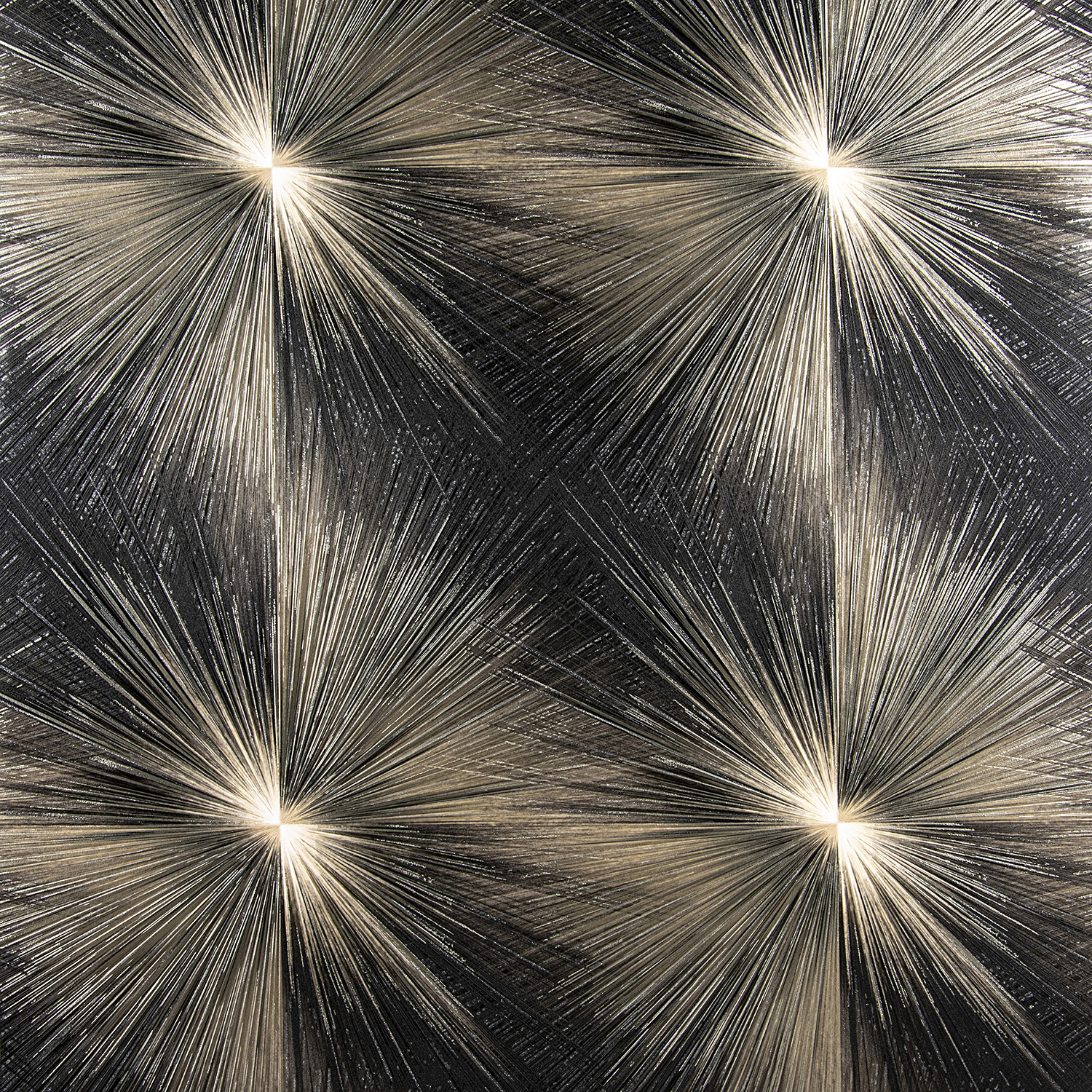 Основу мотива коллекции составляют ритмичные плотные линии-лучи, формирующие сферический узор с ярким центром. Он образует дополнительный орнамент в форме квадратов, который проявляется на расстоянии. А сами линии, пересекающиеся между собой – диагонали. Использование контрастных оттенков, наложение металлика разных цветов, в зависимости от колористики, и мелкодисперсного глиттера на акцентные линии делают мотив ярким и динамичным. Такое дизайнерское решение и активное применение разных спецэффектов создают ощущение, словно множество вспышек озаряют пространство искрящимся светом.