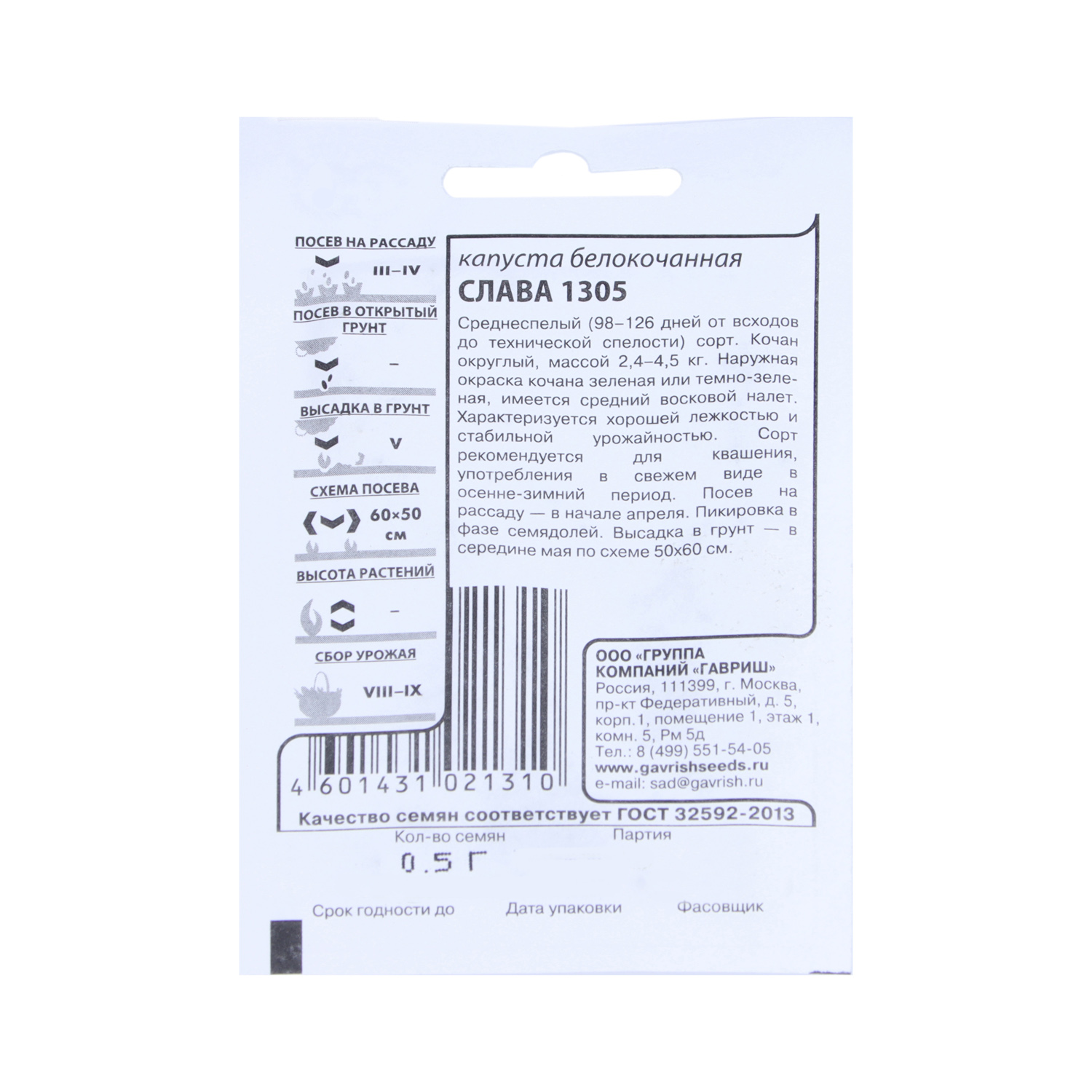 Семена Капуста б/к Слава 1305  0,1гр Гавриш БЕЛ *20/500