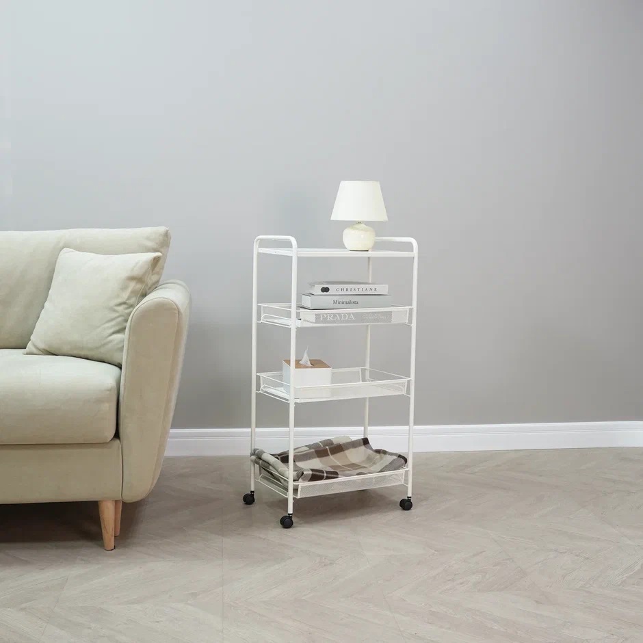 Этажерка металл. "Ладья34КС" 4-х ур.: 3 корз.+Полка, в.0,88м,ш.0,45,гл.0,3м, на кол. Белая Э357Б *1