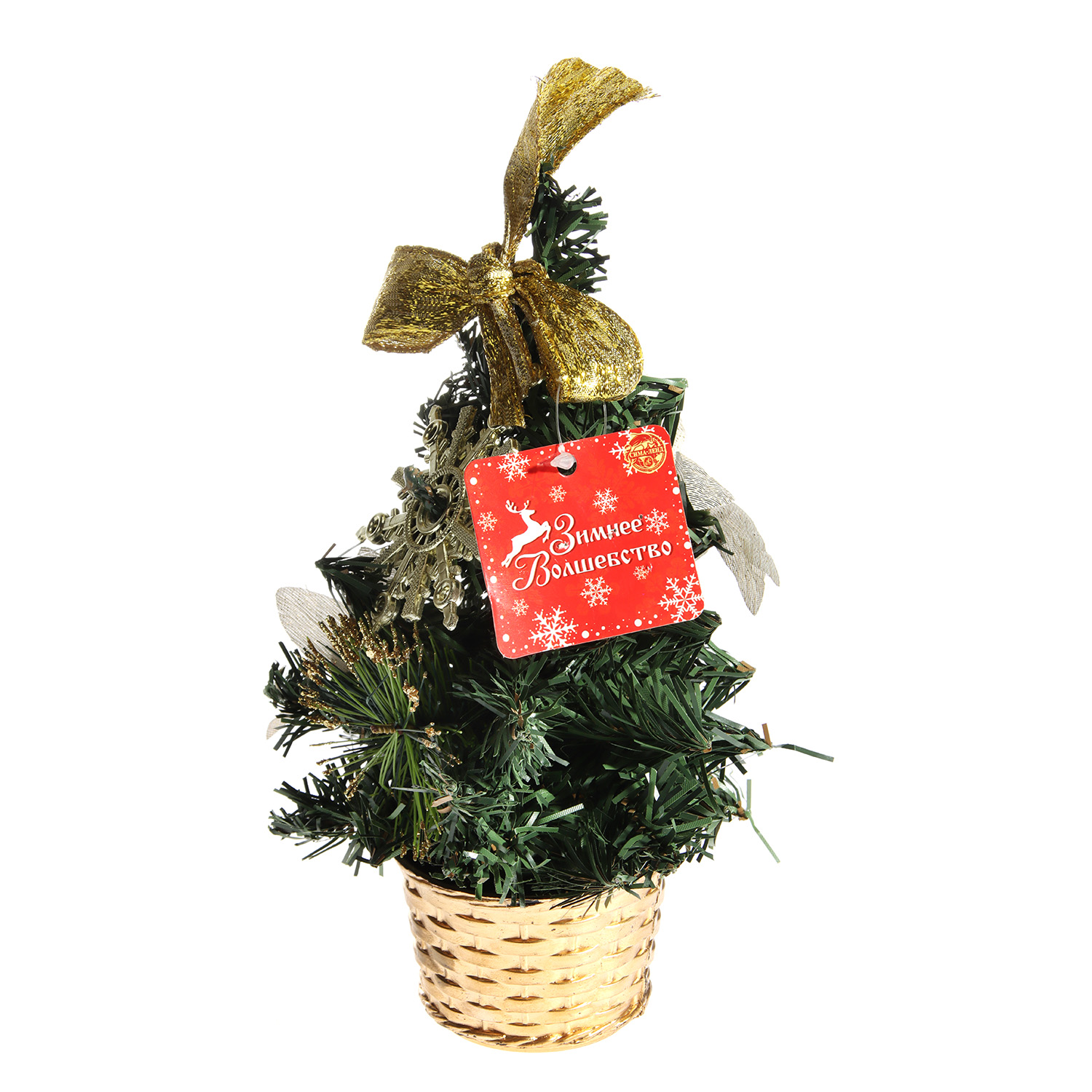 Декоративная елка Зимнее волшебство «Снежинка» – прекрасное решение для символического оформления стола, тумбы или полки к Новому году. Компактная 20-сантиметровая елочка украшена различными декоративными элементами в золотых оттенках и помещена в плетеную корзинку, поэтому деревце выглядит нарядно и празднично. Добавьте интерьеру новогоднего настроения вместе с декоративной елкой Зимнее волшебство!