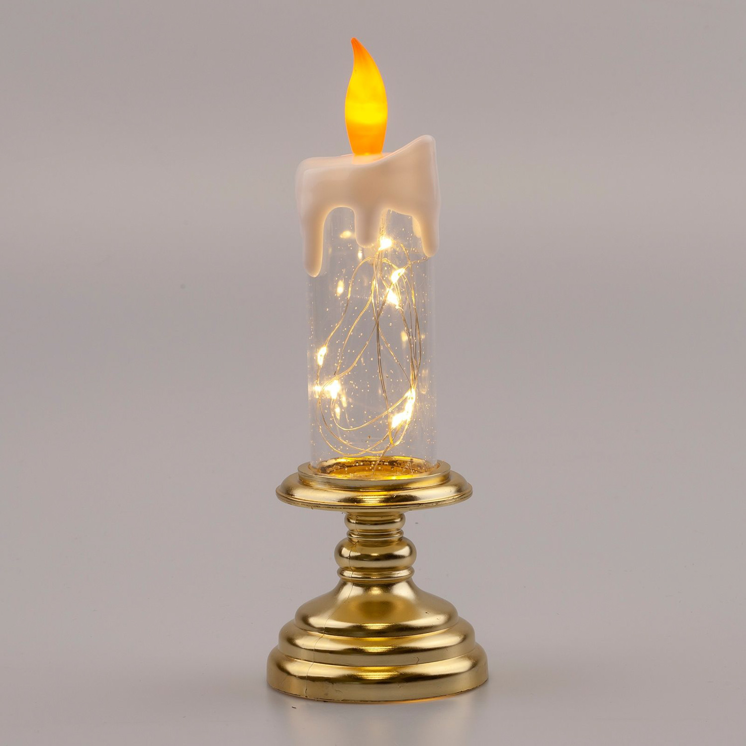 Светодиодный светильник ЭРА «Свеча» с уютным теплым светом создаст атмосферу праздника и волшебства у вас дома. В отличие от обычных свечей, декоративная светодиодная свеча абсолютно безопасна и станет достойным украшением стола в новогоднюю ночь! Светильник работает от 2 батареек AAA и имеет класс защиты IP20 (рекомендуется использовать внутри помещений). Фигура выполнена в виде свечи с прозрачным корпусом, внутри которого находится мини гирлянда из 10 лампочек. Этот настольный зимний светильник – прекрасный подарок для близких на Новый год и Рождество.