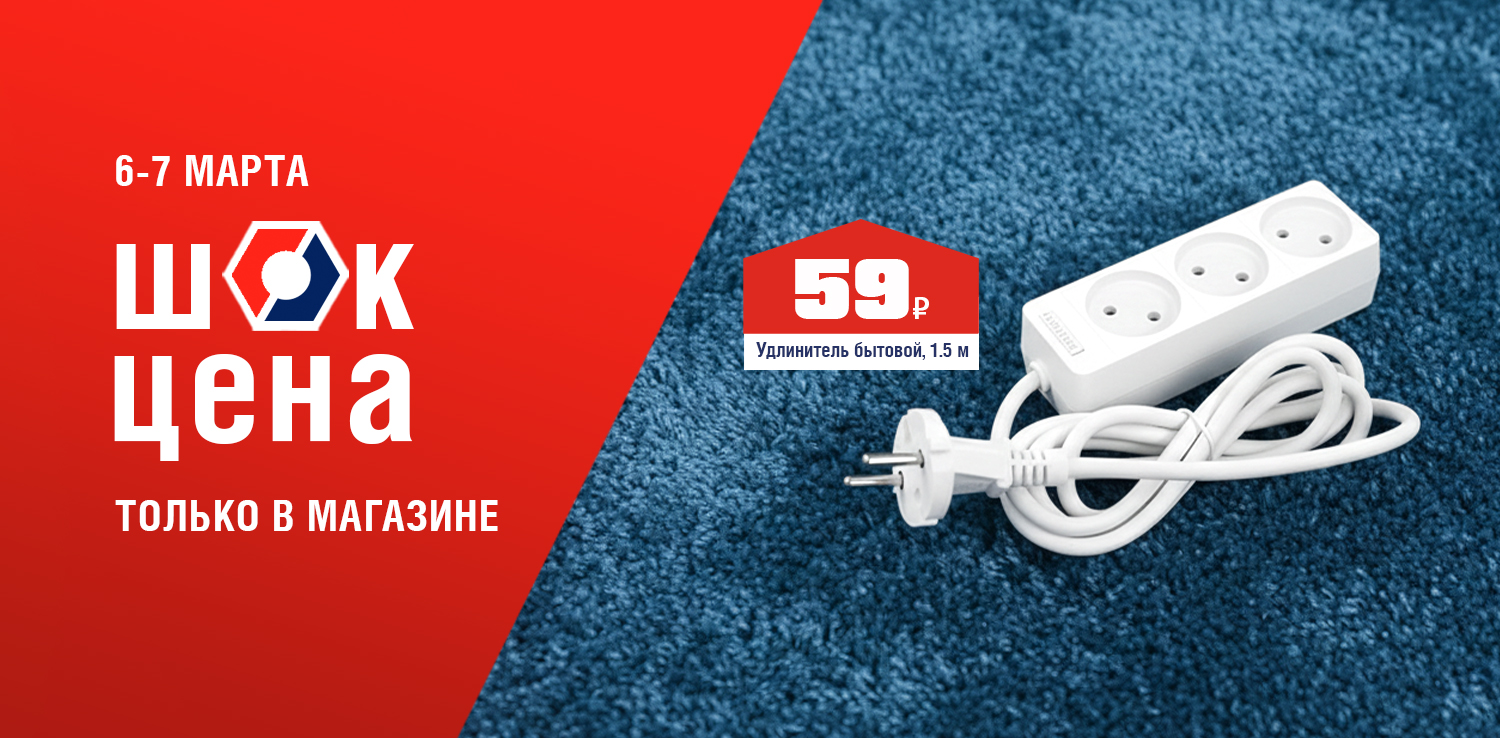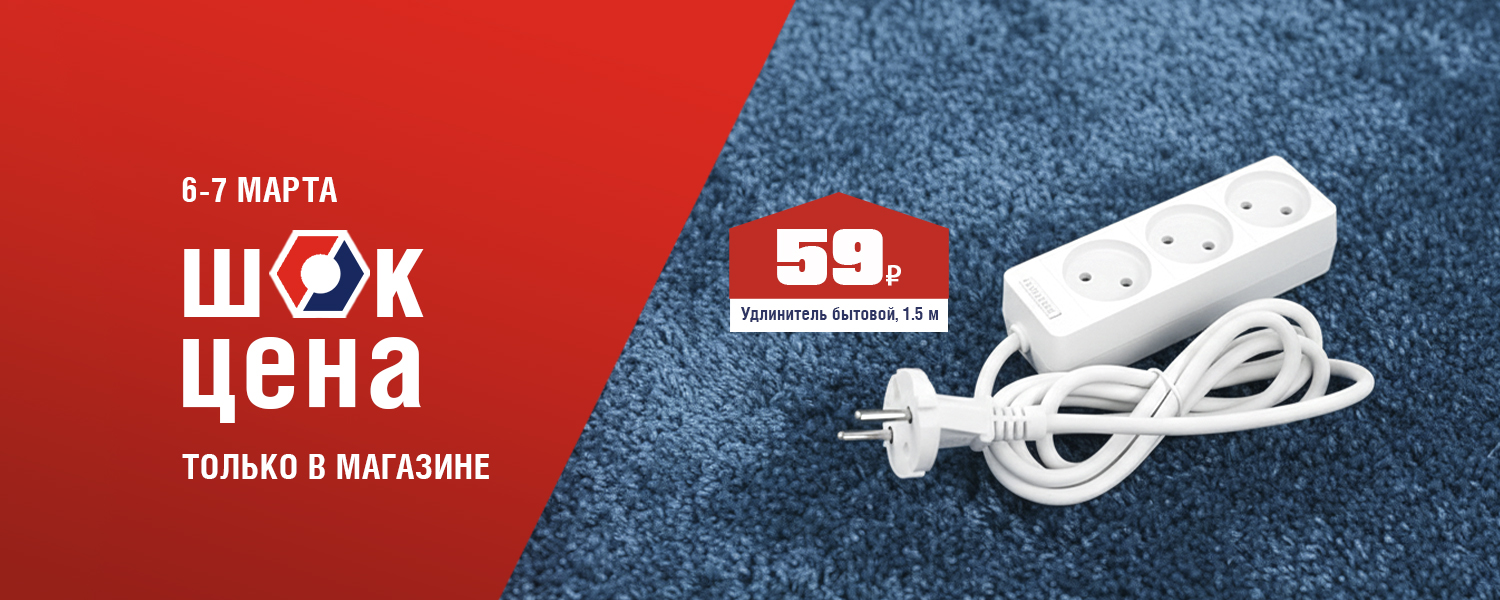 Устали искать свободную розетку? Удлинитель с тремя гнездами подарит свободу вашей технике. Компактный, надежный, выдерживает нагрузку до 2.2 кВт. Подключайте мощные приборы без страха за проводку. 6 и 7 марта в розничных магазинах ДомоСтрой не пропустите ШОК-цену: